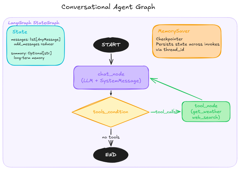 A production-ready conversational agent built with LangGraph that combines short-term memory (checkpointing) and long-term memory (conversation summarization) with real-world tool access.