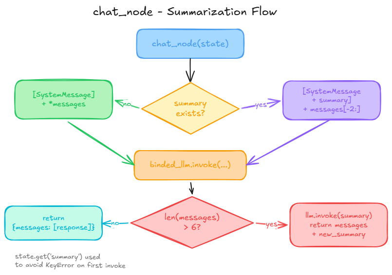 When len(messages) > 6, the node generates a summary of the full conversation history and returns it alongside the response. On the next invoke, the summary is injected into the SystemMessage and only the last 2 messages are sent to the LLM, keeping the context window bounded.