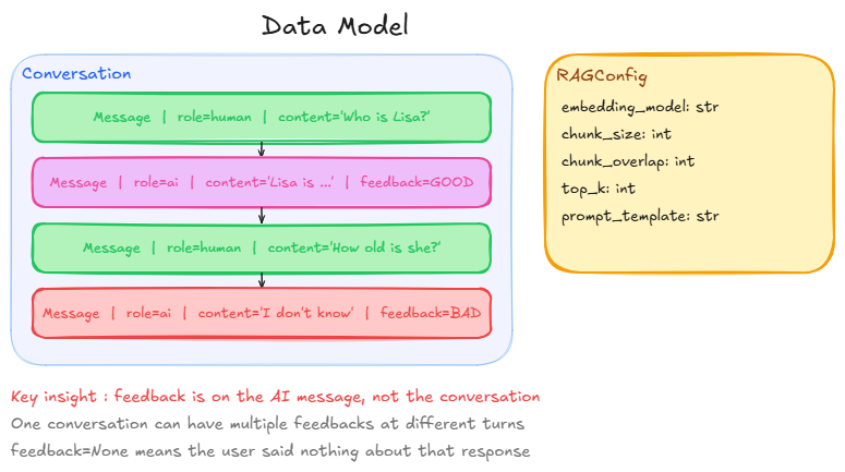 Before writing any logic, we define the objects we are going to manipulate: conversations, messages, and feedback.