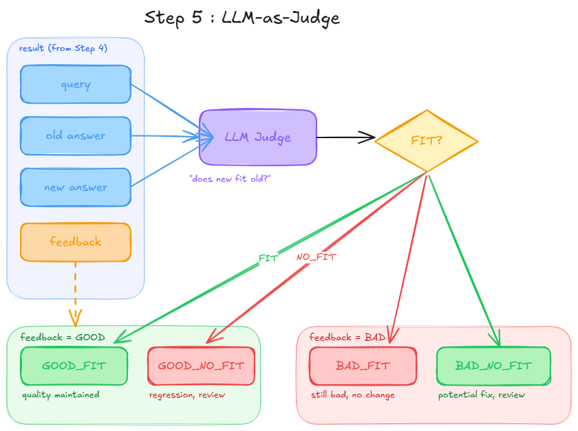 Each result from Step 4 carries old_answer, new_answer, and feedback. We pass all three to the judge. The feedback tells the judge what kind of answer the old one was: that is the anchor for the comparison.
