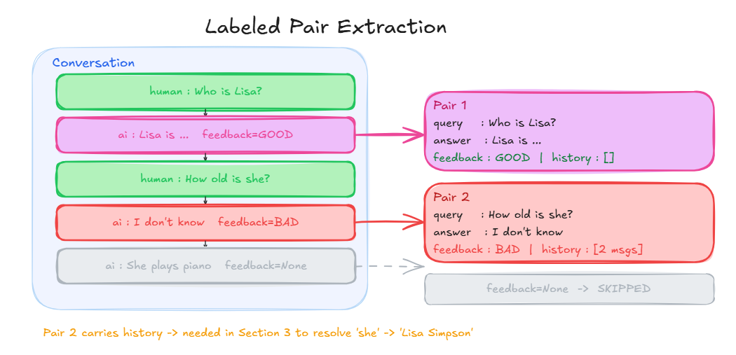We loop over Conversation.messages, find every AI message where feedback != None, grab the human message just before it as the query, and keep everything before that turn as history.